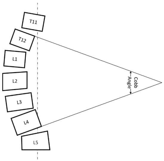 In order to scientifically assess the progression of the disease, a quantitative analysis of scoliosis is a necessary step in scoliosis treatment. Compared to other methods of assessing spinal curvature, the Cobb angle method is preferred for its better reproducibility [7], easier application, and suitability for measuring more severe spinal curvature. In 1966, the Scoliosis Research Society (SRS) adopted the Cobb angle as a standard method for quantifying scoliosis deformities. It remains the most commonly used method for assessing the curvature of the spine to date. The schematic of the Cobb angle is shown in Figure 1.