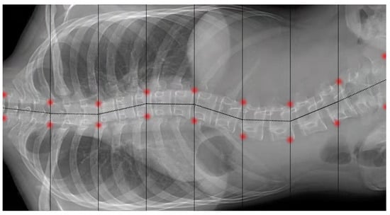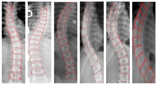 Kusuma, B.A. [52] uses a Canny filter to extract the edges of the vertebral body and cooperate with K-means clustering to find the centroid of the spine segment to fit the midline of the spine. To avoid interference from unrelated structures such as ribs, Duong, L. [53] delineated a region of interest (ROI) for each vertebral body in the training set (where ROI is defined as an area that includes the corresponding vertebral body but is slightly larger than each vertebral body). Then, a mean model was calculated to estimate the areas of each vertebral body’s probability in the test set. A Soft-Margin SVM classifier was trained to segment the vertebral body image from each ROI. Finally, the program fitted the midline of the spine and calculated the Cobb angle by calculating the centroid of the vertebral body.