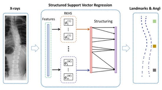 Sun, H. et al. [64] improved the SVR method and proposed a new multi-output regression measurement Cobb angle scheme, S2VR. This method introduces manifold regularization into the framework and obtains a joint estimation of Cobb angles and spine landmarks using their high correlation. They compared the Cobb angle estimated by the S2VR method with the manually measured Cobb angle, with a Correlation Coefficient (ICC) of 0.923 for the middle angle and 0.884 and 0.902 for the remaining two angles, respectively. The framework of S2VR is shown in Figure 5.
