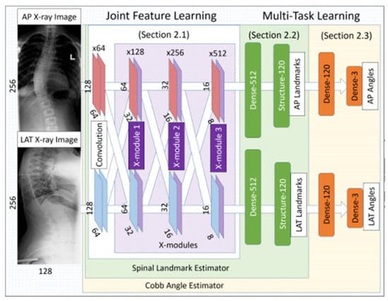 The structure of the MVC-net [67]. MVC-net consists of three parts: a convolutional layer for feature extraction (the convolutional layers are connected with X modules for feature joint learning); a spine landmark output layer and a Cobb angle output layer.