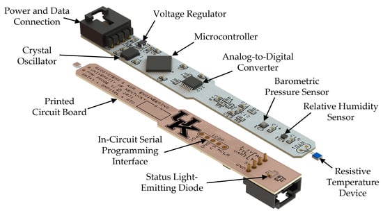 A printed circuit board (PCB) was designed using PCB Artist (V4.0, WestDev Ltd., Aurora, CO, USA) and physically modeled in SOLIDWORKS (V2020, Dassault Systèmes, Vélizy-Villacoublay, France). Figure 1 shows a 3D rendering of the PTH probe with major components annotated. The probe was designed to operate using a 5 VDC source and communicate with a host device via a universal asynchronous receiver transmitter (UART) operated at 3.3 VDC truth table logic (TTL). Power, ground, transmit (TX), and receive (RX) entered the PCB via a 4-pin latching connector (0705530003, Molex, Lisle, IL, USA). The 5 VDC supply was regulated to 3.3 VDC using a linear voltage regulator (TPS73133DBVR, Texas Instruments, Dallas, TX, USA). The 3.3 VDC supply was used to power a microcontroller (DSPIC30F3014, Microchip, Chandler, AZ, USA) along with the pressure, temperature, and humidity sensors. The microcontroller used an external clock source provided by an 8 MHz crystal oscillator (ABM3-8.000HHZ-D2Y-T, Abracon LLC, Spicewood, TX, USA).