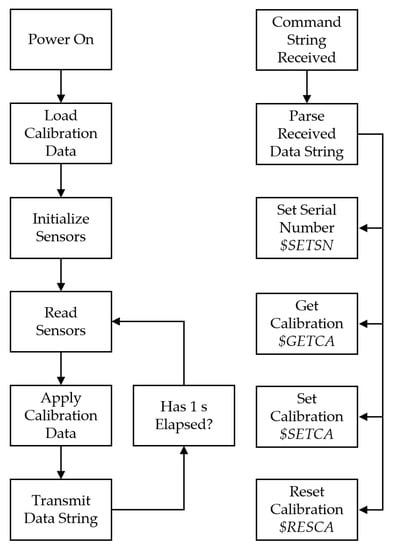 Block diagram of the PTH probe microcontroller firmware generalizing functionality. The main thread handled sensor measurements, data processing, and data transmission. An interrupt service routine handled serial data input from a host device for setting the serial number, retrieving existing calibration data, setting the calibration data to specific values, and resetting the calibration data to factory defaults.