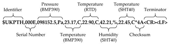 Example formatted string transmitted from the PTH probe to the host at 1 Hz over 3.3 VDC TTL UART. The checksum was the bit-wise exclusive OR of all 8-bit ASCII characters between the ‘$’ and ‘*’ characters and displayed as a 2-digit hexadecimal number. The terminator comprised the non-printable carriage return <CR> and line feed <LF> characters.