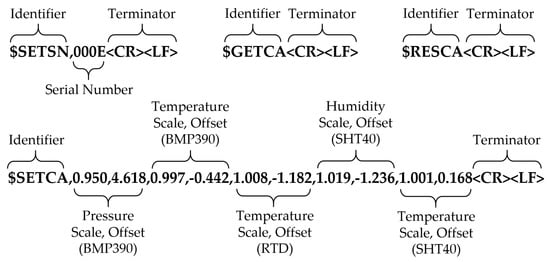 Serial data received by the PTH probe UART followed a similar scheme with some minor differences depending on the data being received. The microcontroller buffered all incoming UART characters and searched the buffer for ‘$’ and <LF> characters. If found in order, all characters between and including were moved from the buffer and flagged as a new message. This process was accomplished in hardware using the UART RX interrupt service routine to prevent received data from being lost. Four message types were supported to handle tasks after the microcontroller firmware had been loaded. Serial numbers were assigned using a Set Serial Number ($SETSN) message. The current calibration data was retrieved using a Get Calibration ($GETCA) message. New calibration data were applied using the Set Calibration ($SETCA) message. Finally, existing calibration data were reset to an offset of zero and a slope of one using a Reset Calibration ($RESCA) message. The exact data format with example parameters are shown in Figure 4.