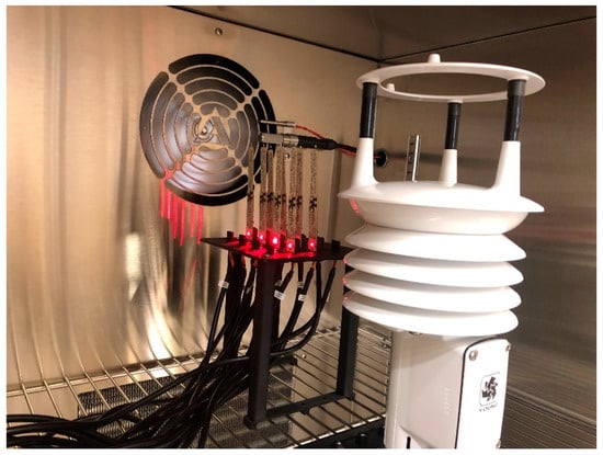 Eight PTH Probes in an environmental chamber. The environmental chamber’s temperature and relative humidity sensors and the weather station’s barometric pressure sensor were used as reference instruments for calibration and validation. The weather station’s ultrasonic anemometer also confirmed that airflow exceeded 1.0 m/s to achieve manufacturer-specified sensor response times.