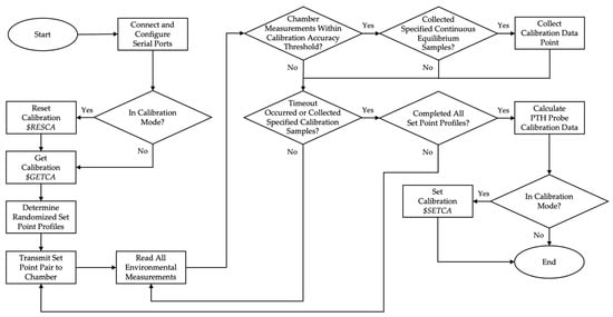 At the start, the user specified the serial ports of both the environmental chamber and weather station, as well as any serial ports that were to be excluded from the calibration process. If the specified serial ports for either the environmental chamber or weather station were not found, a warning was raised, and the user was requested to reinput the information. Otherwise, the serial ports were connected to and configured. RS-485 settings for the environmental chamber were 38,400 Baud, 8 data bits, no parity, and 1 stop bit. The terminator was comprised of the non-printable carriage return <CR>. RS-232 settings for the weather station were 9600 Baud, 8 data bits, no parity, and 1 stop bit. The terminator was comprised of the non-printable carriage return <CR>.