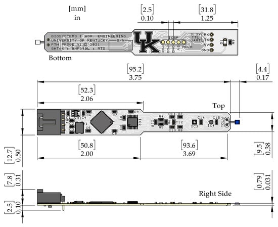 Figure 7 provides the mechanical dimensions of the PTH probe view from the bottom, top, and right sides. Dimensions on the bottom view show the distance from the edge of the PCB to the center pin on the in-circuit serial programmer (ICSP) interface and the spacing between pads. The top view shows the dimensions of the PCB and the typical distance that the RTD platinum resistor extends beyond the PCB. The side view shows the PCB thickness and the distance that the power and data connector extend above and below the bottom of the PCB.