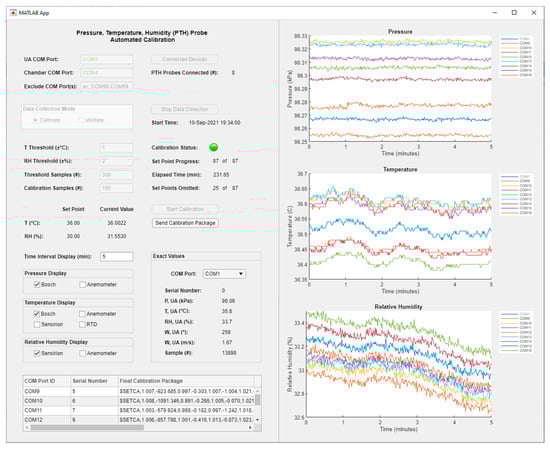 Figure 8 shows the graphical user interface (GUI) of the automated calibration program. The graphical displays included three separate plots for pressure, temperature, and relative humidity with adjustable visibility options for measurements from the different sensors on the PTH probes and the weather station. While the time interval for the plots defaulted to displaying the most recent five minutes of data, which was approximately equivalent to 300 data samples, it was able to be adjusted by the user throughout the calibration/validation run. Included in the display was also a drop-down menu comprised of a list of the weather station and PTH probe serial ports. When a serial port was selected, the exact measurement values for the corresponding component were updated on the interface.
