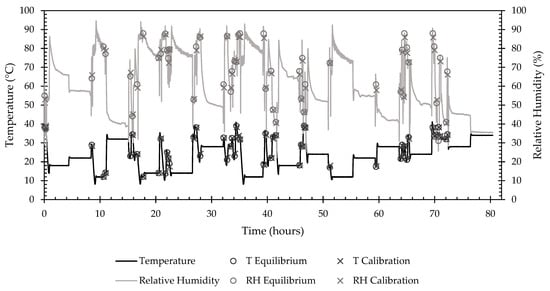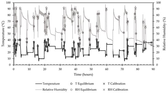 The validation run took 80.38 h to complete a temperature and relative humidity setpoint profile with 66 setpoint combinations (Figure 13). Of the 66 pairs, 15 did not reach equilibrium within the specified timeout period and were excluded from the calibration calculations.