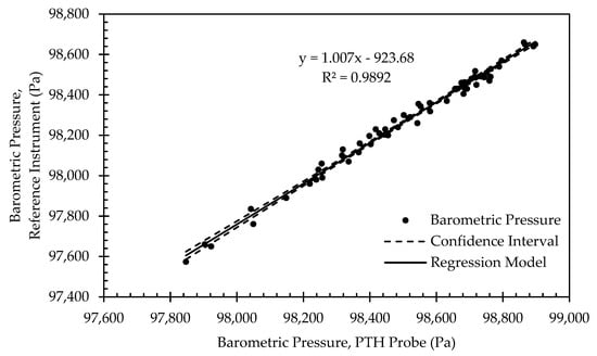 Regression model and corresponding confidence interval for barometric pressure validation data from representative PTH probe (SN: 0x0005).