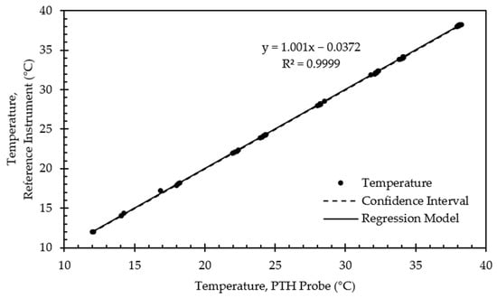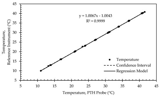 Figure 15 presents example validation results for the RTD sensor. Validation points were similarly clustered near the target setpoints with some deviation due to the 1 °C tolerance threshold allowed for calibration data collection. The relationship between the RTD temperature output and the reference instrument remained highly linear (R2 > 0.99). The slope was nearly 1, and there was a 0.04 °C bias in temperature for this particular PTH probe, which was reduced from its uncalibrated bias of 1 °C. The offset varied in magnitude between 0.004 °C and 0.138 °C for all PTH probes (Table 10).