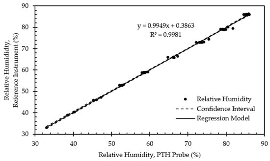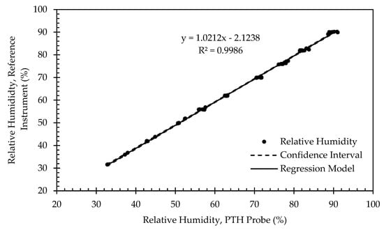 Figure 16 presents example validation results for the relative humidity sensor. Relative humidity calibration points were again clustered near the target setpoints with additional scattering due to the 2% RH tolerance threshold allowed for validation data collection. The relationship between the relative humidity sensor and the reference instrument remained highly linear (R2 > 0.99). The slope was nearly 1, and the offset was further reduced and maintained within the typical accuracies of the SHT40 and the reference instrument. The offset varied in magnitude between 0.306% and 0.468% for all PTH probes (Table 10).