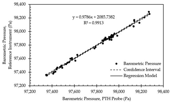 Example calibration data for a single PTH probe are shown in Figure 10, Figure 11 and Figure 12. Figure 10 presents example initial calibration results for the barometric pressure sensor. While the linear regression model proved to be a good fit, offset from the linear regression exceeds the expected absolute accuracy of the BMP390. This was likely due to the limited range of samples, roughly 1000 Pa, which only represented 1% of the full-scale output range of the sensor. Limited range combined with the distance to the intercept meant that small changes in the slope of the linear regression resulted in a large offset. All eight PTH probes exhibited a similarly large offset. Thus, the linear regression was deemed unsuitable for the barometric pressure calibration data, and a 1-point calibration was applied using the average offset between the PTH probe and the reference instrument. The offset varied in magnitude between 236.9 and 307.6 Pa for all PTH probes (Table 6).
