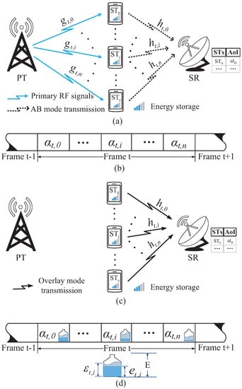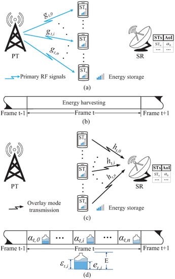 In the secondary network, as the random distribution of the SUs in [39], the SR and STs are randomly placed within the coverage of the primary RF signals from the PT, as shown in the Figure 1a,c. Each ST is equipped with a single antenna and a rechargeable capacitor with finite capacity E. The SR is equipped with a single antenna and a wired energy source, hence there is no need to consider the energy supply of the SR. In order to measure the freshness of the data that the SR receives from STs, SR has capability to record the AoI of the data from each ST. Similar as [40], the SR plays the role of center controller to manage the time and energy for STs. At the very beginning of the frame, the SR senses the channel, and then provides the allocation of time and energy for STs.