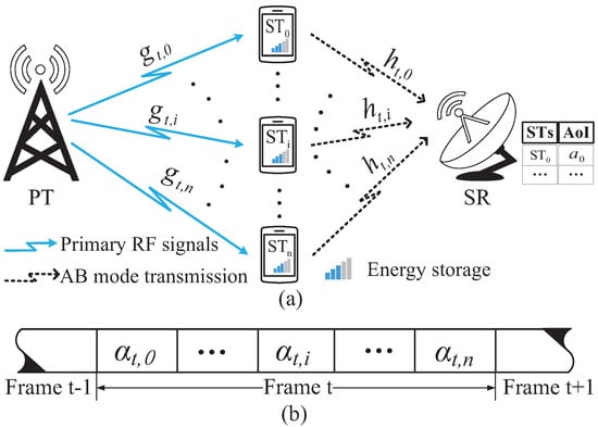 System model and frame structure of the ABCs: (a) depicts the system mode when . (b) depicts the time frame structure when .