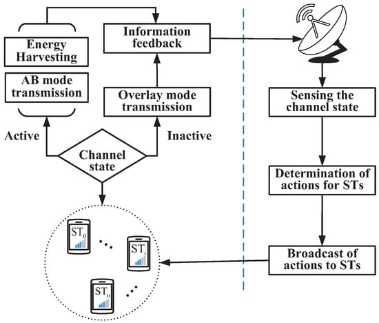 We provide a flow chart of the ABO-CRN in Figure 4. The actions in Figure 4 are executed by STs according to . The SR decides the time and energy allocation of STs according to the channel information and states of each ST. The channel information includes the channel state and channel gains. The states of each ST include the available energy and the AoI of the current frame. Note that, the feedback information in Figure 4 includes two parts. The first part is the new energy state in each ST, which is the available energy of the next frame. The second part is the received reward after STs execute the actions decided by the SR.