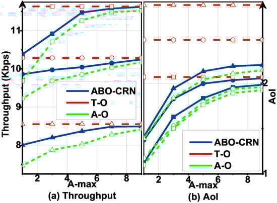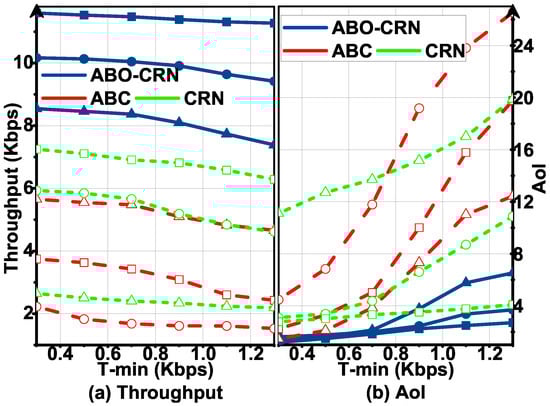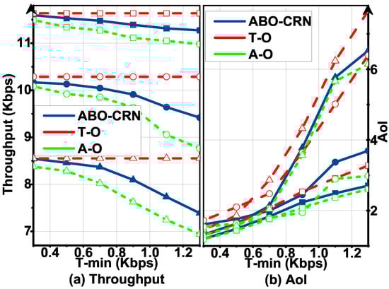Figure 6 plots and AoI of the ABO-CRN, T-O baseline scheme, and A-O baseline scheme with the minimum throughput requirement under 0.3, 0.6, 0.9. We observe from Figure 6a that of the ABO-CRN decreases with , and observe from Figure 6b that AoI of the ABO-CRN increases with . For T-O baseline scheme, the throughput does not change with , and the AoI increases faster than that of the ABO-CRN and A-O baseline scheme. The throughput of A-O baseline scheme decreases faster with than that of the ABO-CRN. The AoI of A-O baseline scheme increases with , is close to that of the ABO-CRN, and is lower than that of T-O baseline scheme. The reasons can be explained as follows. When increases, each ST needs more throughput to reach the minimum throughput requirement. The SR in the ABO-CRN has to allocate more time and energy for the STs with high AoI and poor channel quality, and sacrifices the total throughput to satisfy the AoI constraint.
