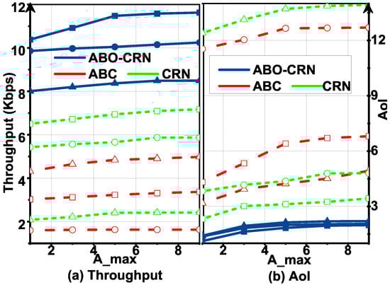 Throughput and AoI versus under 0.3 (circle), 0.6 (square), 0.9 (triangle) compared with that in the ABCs and CRNs, and bps: (a) describes the throughput performance. (b) describes the AoI performance.