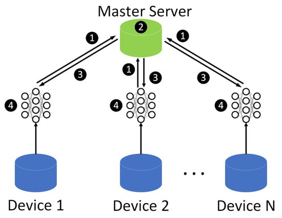 In this paper, the federated learning framework is a horizontal federated learning architecture since the data collected by devices is in the same feature space. It uses a master–slave architecture, as shown in Figure 1. In this system, N participant devices collaborate to train a machine learning model with the help of the master server.