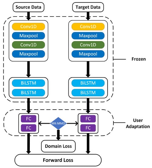 Since learned features transition from general to specific along the network with increasing domain discrepancies, the lower CNN and BiLSTM layers catch general features that can transfer from different houses. Hence, the parameters in the first dashed box in Figure 3 are frozen during user adaptation, whereas the weights of FC layers are updated by the total loss, as shown in Formula (12).