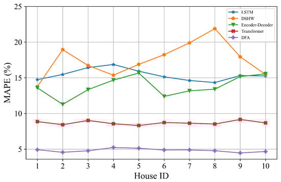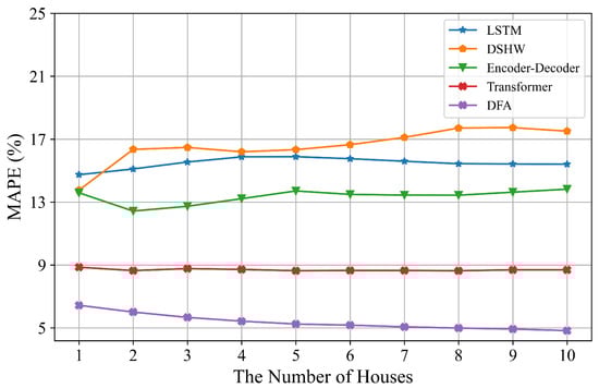 From Table 2, we can see that the proposed DFA consistently outperforms the baseline models for ten houses. On average, it shows 38.28%, 69.83%, 58.81% and 63.65% relative improvements over Transformer, DSHW, Encoder–Decoder and LSTM, respectively, based on skill scores. The performances of LSTM and Encoder–Decoder are similar to each other and worse than Transformer since the number of parameters is less compared to Transformer. Performances of DSHW fluctuate widely and are inferior to the other models based on deep learning. We believe this is due to the differences in the cyclical characteristics in different spans which are influenced by many uncertain factors in residential loads. In summary, DFA has the best performance. We conclude that one of the reasons for the remarkable superiorities is DFA uses all datasets from ten houses to learn a model in the federated architecture. Additionally, we calculate the curve of MAPE values by varying the number of houses as shown in Figure 6. It can be seen that MAPE values of DFA gradually decrease with the number of houses increasing whereas other models do not vary much. This means that the model will be more robust when more devices are connected to the systems in the reality. More discussions about the superiorities in forecasting performance can be found in Section 4.6.