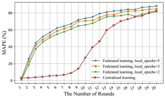 From Table 3, it can be seen that the forecasting performance of the federated architecture is superior to the centralized while making predictions for STLF in the conditions of the different numbers of local records with . When and records increase, the federated architecture can make use of more data to train the model, the forecasting performance will improve.