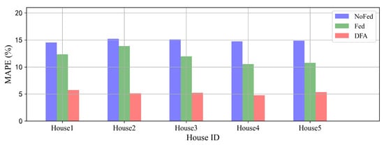 The proposed DFA and four baseline models are evaluated on 10 randomly chosen target houses. For each target house, the load records from June 2012 to June 2013 are used as training data, and 720 load records in September 2013 for prediction to calculate MAPE values. DFA makes use of all datasets of ten houses in the federated process and leverages the datasets from the target house to operate user adaptation. Baseline models are trained with the data from the target house. Table 2 shows the MAPE values of DFA and baseline models for 10 houses. Figure 5 shows the MAPE values for direct observation.