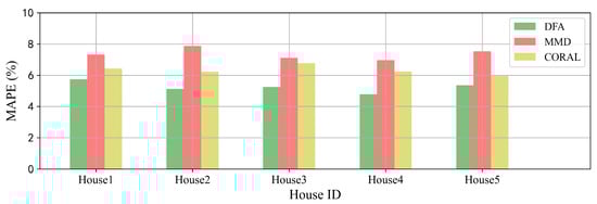 We use Fed to denote the DFA without MK-MMD optimization which is a CNN-LSTM network trained by the federated architecture. NoFed denotes the CNN-LSTM model trained by the centralized architecture with data only from the target house. We can see from Figure 8 that Fed achieves a better performance than NoFed on each target house. This indicates that each target house benefits from the federated architecture which makes it possible to leverage datasets from other houses, ensuring privacy simultaneously. It also can be seen that DFA has remarkable improvements in performance compared with Fed. We conclude that the transfer learning method can successfully conduct knowledge transfer from the federated model to the target houses to improve forecasting performance.