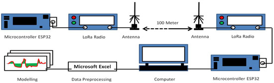 For measurement, there are several radio interfaces that are usually used for WSN communication, such as LoRa [38], Wi-Fi [39], Zigbee [25], Bluetooth [40], and many more. However, in this conducted research, we used LoRa because it can achieve long range communication [41]. In a lot of reported literature, LoRa can achieve 900 m more [42] and even more in the kilometer range [43]. For measurement, we used a LoRa transmitter and receiver pair. The transmitter was paired with microcontroller ESP32. This way, we could program the LoRa transmitter using the microcontroller to send data (packet data containing “hello” word) wirelessly to the LoRa receiver every 100 microseconds. At the receiver site, the data transmission was received by the LoRa Radio receiver. Because the data that LoRa radio received was in hexadecimal format, the microcontroller ESP32 decoded it, extracted the RSSI value, and sent those values directly to our laptop every data transmission round. Measurements were performed using walk test for every 5 m from starting point up to 100 m. The measurement data were then fed into Fuzzy ANFIS as data training, and thus provided Near Ground LoRa Electromagnetic Wave Propagation model for all observed sites. The LoRa transmitter and receiver were placed directly on top of the soil with antenna height less than 30 cm from the soil (see Figure 1). The equipment parameters’ detailed configurations are noted in Table 1.