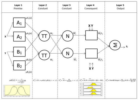 Fuzzy system is mainly used for control, such as controlling robot movement [44,45], speed [46], and other factors [47,48,49]. However, fuzzy system can basically be used for anything. Adaptive Neuro Fuzzy Inference System (ANFIS) architecture based on Jang’s research consists of five stages [41,42], as shows in Figure 3. The square-shaped nodes show adaptive nodes, while the circular shapes are the fixed nodes.
