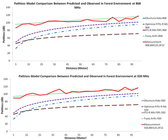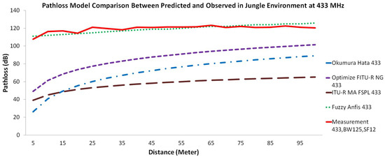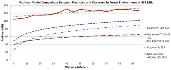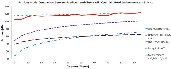 The statistical error analysis concept tells us that the smallest value indicates that the model has the best matching performance between the predicted values and observed values. We can see that the best model based on statistical evaluation is fuzzy ANFIS with the lowest RMSE score of 0.88 at 433 MHz for the open dirt road environment and the lowest MAE score of 1.61 at 433 MHz also for the open dirt road environment. The second-best model would be Optimized FITU-R Near Ground with the lowest RMSE score of 4.08 at 868 MHz for the forest environment and the lowest MAE score of 14.84 at 868 MHz for the open dirt road environment. The third best model would be Okumura-Hata with the lowest RMSE score of 6.32 at 868 MHz for the forest environment and the lowest MAE score of 26.12 at 868 MHz also for the forest environment. The worst model would be the ITU-R Maximum Attenuation free space with the lowest RMSE score of 9.58 at 868 MHz for the forest environment and the lowest MAE score of 38.48 at 868 MHz for the jungle environment.