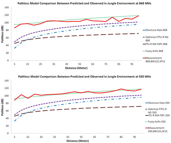 Our initial measurement result shows varying signal strength for each measurement point and each radio configuration. This problem we encountered was caused by different propagation phenomena such as diffraction, refraction, and reflection of the transmitted signal because of the surrounding vegetation environment [54]. As stated in Section 1, in the jungle, forest, or open road environment, vegetation and other things can induce small-scale multipath fading for the electromagnetic wave. However, as we observe the multipath fading in the dense jungle, the jungle is not as static as it may seem. The spatial distribution component of the multipath loss was clearly evident in the measured values collected at different points in the jungle. The temporal distribution component of the multipath loss in the jungle was also present in the fluctuation of the received signal strength at any point. This fluctuation is due to the dynamic movement of hidden obstacles on the jungle floor, tree trunks, canopies, and treetops. The jungle is rich with livestock of birds, squirrels, monkeys, rats, and many other living animals, in addition to the humans conducting the experiments. If we also add this factor, the effect of occasional wind can also result in detectable fluctuation in the RSSI. As expected, the multipath temporal distribution component is not as severe as it is in a typical urban environment. Evidence of this environmental dynamicity can be captured using a highly sensitive microphone or high frame rate camera. Therefore, to make the measurements reliable, we transmit 10 packet data and perform averaging for its signal strength. Even though we performed averaging for each measurement point, we still found that every measurement point also had a varying measurement result from other nearby measurement points. This was reflected in the zig-zag measurement chart for every environment.