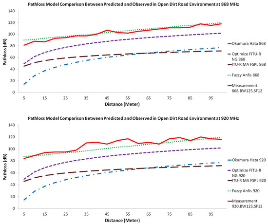 Pathloss model comparison between predicted and observed value in open dirt road environment for frequency carrier (top) 433 MHz, (middle) 868 MHz, and (bottom) 920 MHz.