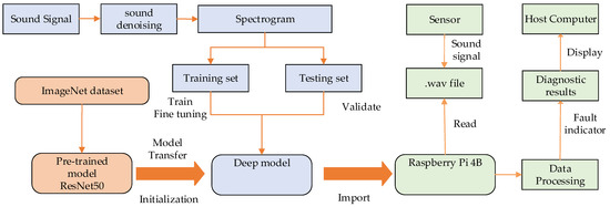 The pipeline robot fault diagnosis system based on sound signal recognition consists of three parts: hardware, software, and algorithm. The hardware part includes the sound sensor and Raspberry Pi. The Raspberry Pi is the core module. On the one hand, it is responsible for installing the program running environment, denoising the collected sound by wavelet threshold denoising algorithm, preprocessing the signal, extracting features, and deploying the trained sound model. On the other hand, it is also responsible for the data transfer between the modules, including storing the raw sound data collected by the sensors and transferring the diagnosis results to the host computer interface. The algorithm part proposes an end-to-end fault prediction method. ResNet50 was selected as the pretraining model of a deep convolutional neural network, and the fault classification problem of the pipeline robot was solved by fine-tuning the ResNet50 model based on the idea of migration learning. The underlying features were extracted using the pretrained network and the higher levels of the neural network were fine-tuned using time–frequency images. The fault diagnosis system of the pipeline robot based on sound signal recognition is shown in Figure 1.