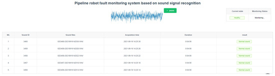 The health status is a monotonic function that changes over time, and it will eventually cross a threshold, leading to a fault status. Through the real-time changes in the host computer interface data, one can have a better understanding of the health status of the pipeline robot. The upper computer interface is shown in Figure 4. The host computer interface can display the current operating status and changes in the sound signal and view the past monitoring conditions.