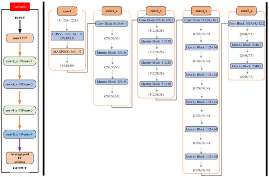 The pretrained model used in this study was a 50-layer deep convolutional network created by Resnet50 [26], which achieved accurate classification performance on the ImageNet dataset. ResNet-50 is one of the most advanced network architectures for CNNs. By introducing residual learning, ResNet-50 can effectively avoid the gradient disappearance and degradation caused by deepening the layers of the network. Instead of simply learning the potential mapping between input x and output H(x) directly, ResNet-50 learns F(x) + x by adding the residual to the input through the residual between them, F(x) = H(x) − x. Resnet-50 has two basic blocks, named Conv Block and Identity Block; the details of this architecture model used in our study are shown in Figure 5. It consisted of several stacked Conv Blocks and Identity Blocks, with 49 convolutional layers and one SoftMax layer. ResNet-50 has superior performance in processing image classification tasks.