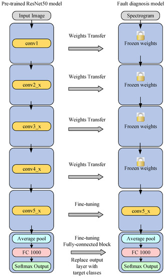 The ResNet50 model was trained on ImageNet. As the time–frequency image of the fault data is different from the natural image, it is necessary to fine-tune more residual blocks of the pretraining model. We transferred the weights of the first four residual blocks and fine-tuned the weights of the last residual block and the fully connected layer.