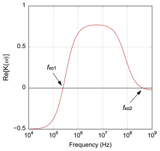 There are two crossover frequencies in the single-shell model, as shown in Figure 1. In this study, the lower crossover frequency, , was investigated. The crossover frequency, , can be written as follows [25,26]: