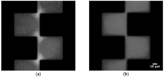 Typical images of exosome DEP. The fluorescent-labeled bovine milk exosomes were suspended in NaCl solution (20 µS/cm). (a) p-DEP at 1 MHz and (b) n-DEP at 100 kHz.