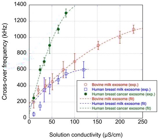 A frequency ranging from 100 kHz to 3 MHz was applied with a 100 kHz increment to determine the crossover frequency. Exosomes were suspended in solutions of various conductivities. The conductivity was adjusted using NaCl. Figure 3 shows plots of the determined crossover frequency against the solution conductivity. A frequency higher than the crossover frequency caused p-DEP on the exosomes, whereas the lower frequency caused n-DEP. The bovine milk exosomes and human breast milk exosomes showed similar profiles. The human breast cancer exosome showed a profile different from the others.