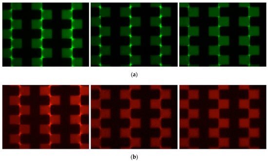DEP separation of the exosomes. The human breast milk exosome (a, green) and the human breast cancer exosome (b, red) were mixed. The frequencies of the applied voltage were 1 MHz, 700 kHz, and 300 kHz (left to right). The photos are shown in pseudo-color images. The conductivity of the suspension medium was 40 µS/cm. The magnitude of the applied voltage was 20 VPP.