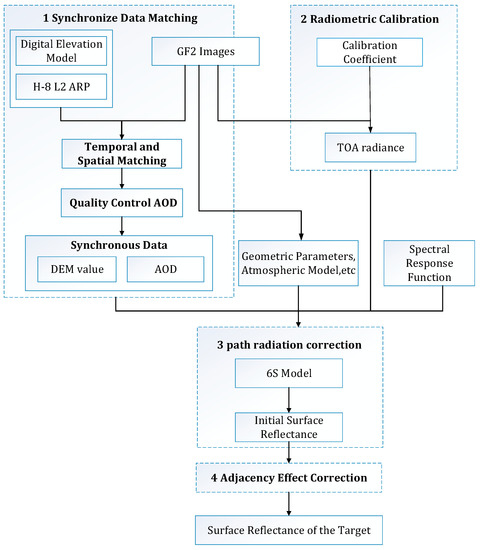 Cao et al. [16] corrected Gaofen-2 (GF-2) high-spatial-resolution (HSR) satellite multispectral data with AOD retrieved from the moderate-resolution imaging spectroradiometer (MODIS) data. Compared with the relative error of reflectance before atmospheric correction, the difference between the corrected SR and the measured reflectance was obviously narrowed. David et al. [17] proposed a MODIS-based method that used AOD, aerosol type and water vapor from MODIS Terra to correct Landsat Enhanced Thematic Mapper Plus (ETM+) acquisitions in each coincident orbit. The performance of the MODIS-based atmospheric correction is better than that of the image-based the Landsat Ecosystem Disturbance Adaptive Processing System (LEDAPS) method. Basith et al. [18] used the AOD parameter which was retrieved from SR inversion involving daily global SR products of MODIS, to corrected Landsat-8 images based the 6S method. The results of atmospherically corrected images were agreeable with the Landsat 8 Level-2 products. However, the satellite with a Sun-synchronous orbit cannot provide a high-temporal AOD, which is hard to match the HSR satellite data such as GF-2. More and more new generation geostationary meteorological satellites have been launched, such as Himawari-8 (H-8) [19], Fengyun-4 [20]. Wang et al. [21] conducted work dedicated to exploiting information from the diurnal variability in the hypertemporal geostationary observations for atmospheric correction, and the result of the algorithm correction agreed well with the ground-based measurements. The method shows that the high-temporal-resolution observation information can help to address the atmospheric correction problem. It is necessary to propose a fully automatic and efficient atmospheric correction method for HSR satellite images, taking advantage of atmospheric products provided by geostationary meteorological satellites [22].