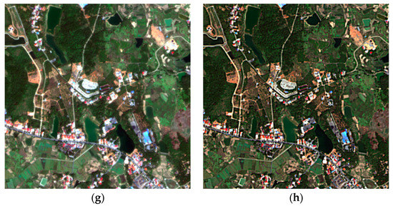 Sixteen GF-2 multispectral images were corrected by QUAAC. The visual comparison between the images before and after QUAAC correction is shown in Figure 3. It is found that after QUAAC, the clarity and contrast of the images are visually improved.