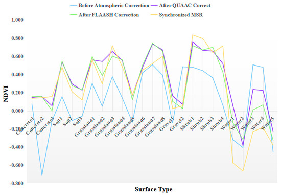In this experiment, the following typical surface types were also selected as samples: concrete floor, soil, grassland, gravel, shrub, and water. The NDVI of these objects is calculated, and the NDVI of the surface types before and after QUAAC correction is compared as shown in Figure 4. The results indicate that the NDVI of all surface types changes, and the NDVI of corrected green vegetation is significantly increased. The NDVI curves of QUAAC correction, FLAASH correction, and MSR involve many overlapping parts, and numerical gaps are small. This shows that QUAAC improves the ability of extracting green vegetation information, which is beneficial to the distinction between green plants and other surface types.