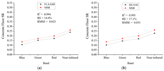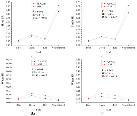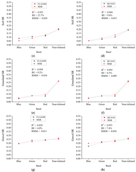 The synchronized MSR is used as the reference data. Multispectral images on the same date and location after FLAASH and QUAAC correction are selected. We compare the FLAASH/QUAAC−corrected SR of concrete floor, soil, grassland, gravel, shrub, and water with the synchronized MSR respectively. The, RE, and RMSE are used to evaluate the accuracy. The comparison charts are shown in Figure 5.