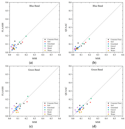 The scatter diagram in Figure 5 shows that the surface types in the four bands are distributed around the diagonal as a whole. In the blue, green, and red bands, the SR are basically below 0.25, and in the near-infrared band, the SR spans are larger, from 0 to 0.6. The statistical index of FLAASH, QUAAC, and MSR as listed in Table 5 show that QUAAC is better than FLAASH in each index in each band. The QUAAC−corrected effect is the best in the near-infrared band. Probably because the QUAAC computes the atmospheric radiative transfer more correctly. Generally, the QUAAC−corrected SR and synchronized MSR have a small deviation, high similarity, and consistent spectral trend.