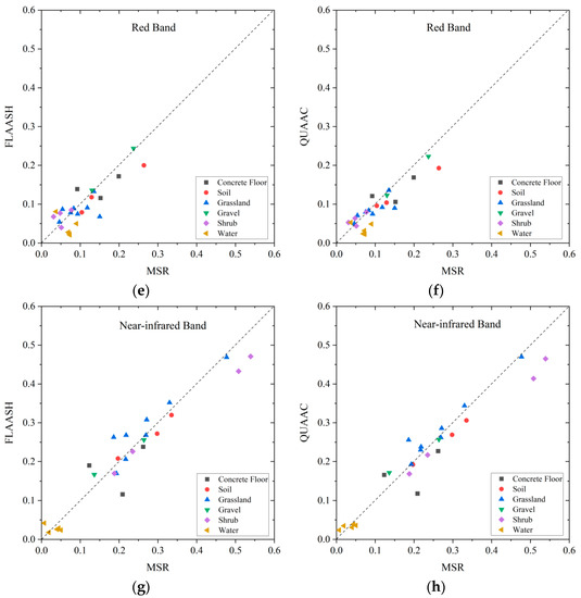 Scatter plots of QUAAC (right column) and FLAASH (left column) corrected SR versus MSR in each band. From top to bottom, the four bands are blue (a,b), green (c,d), red (e,f), and near-infrared (g,h). Different shapes and colors in the figure represent different surface types.