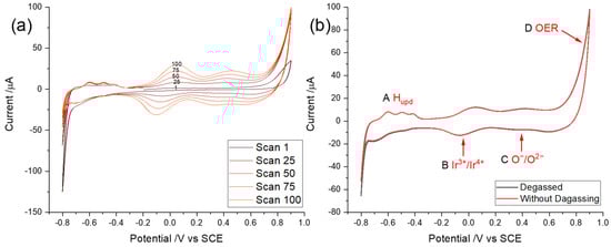 Cyclic voltammetry was conducted to study the formation of iridium oxides on the surface of an iridium wire and other redox reactions that occur during potential cycling. It was discovered that to ensure reproducible data, the surface of the Ir wire should be free of oxide prior to voltammetric measurements. Accordingly, as reported in previously [48], the Ir surface was treated by pre-flaming to renew the surface of the metal electrode between experiments. To explore the voltammetric behaviour of an Ir wire and the effect of degassing, the pre-flamed Ir electrode was first immersed in air-saturated synthetic seawater buffered by Tris(hydroxymethyl) Aminomethane/HCl to give a pH close to typical natural seawater (8.1 [9]), and then the same process was repeated in a degassed solution. Cyclic voltammetry was conducted for 100 cycles starting at a potential of −0.2 V vs. SCE with scan reversal at a potential of 0.9 V with a subsequent sweep to −0.8 V vs. SCE where the potential was again reversed as shown in Figure 2a. In Figure 2b, the 40th scan of cyclic voltammograms obtained in synthetic seawater with and without degassing are overlaid. It is thought that this procedure leads to the steady build-up of a surface layer, the thickness of which increases with each potential cycle, which displays several redox features in conventional electrolytes [69,70,71] and are closely mirrored in the data obtained in seawater as shown in Figure 2. Note that comparison of the data with and without degassing shows no difference of peak shape or numbers of peaks between the two, with four clearly discernible voltammetric features labelled as A, B, C, and D. This comparison implies that degassing has no effect on the voltammetry and represents an important step in respect of developing amperometric pH measurements for direct use in seawater without the need for removal of oxygen from dissolved air.