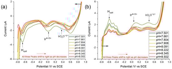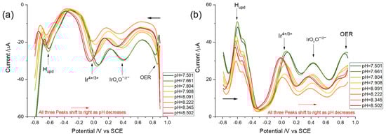 Thus, the redox feature of interest correlates with the onset of the ORR. Meanwhile, the trend of signal to background level improvement gets less significant when the potential limit is extended either more anodically or cathodically, consistent with literature reports [80,82]. Noting that Pickup et al. [80] reported that the hydrous oxide begins to dissolve when more positive potentials were applied, so no further extension of the potential window was explored. Considering the data in Figure 3, we infer that potential sweeps within the ranges (A) −0.6 V to −0.8 V (Hupd region) and (B) 0.7 V to 0.9 V (OER region) are both important for the growth of the Ir hydrous oxide. To be specific, anodic sweeps to 0.9 V and cathodic to −0.8 V vs. SCE must be embraced by the potential window, so that the in situ fabrication method of an Ir wire responds well to pH.