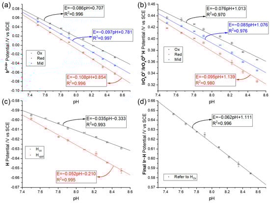 Plots of oxidation (black dots), reduction (red dots) peak, and midpoint (blue dots) potentials against pH value with the latter read from a pH meter (defined using total hydrogen ion scale) (a) IrIII/IV (b) (c) Hupd/Hox and (d) IrIII/IV midpoints pH dependency referring to Hox; x-axis error-bar is the uncertainty of pH measured by a pH meter.